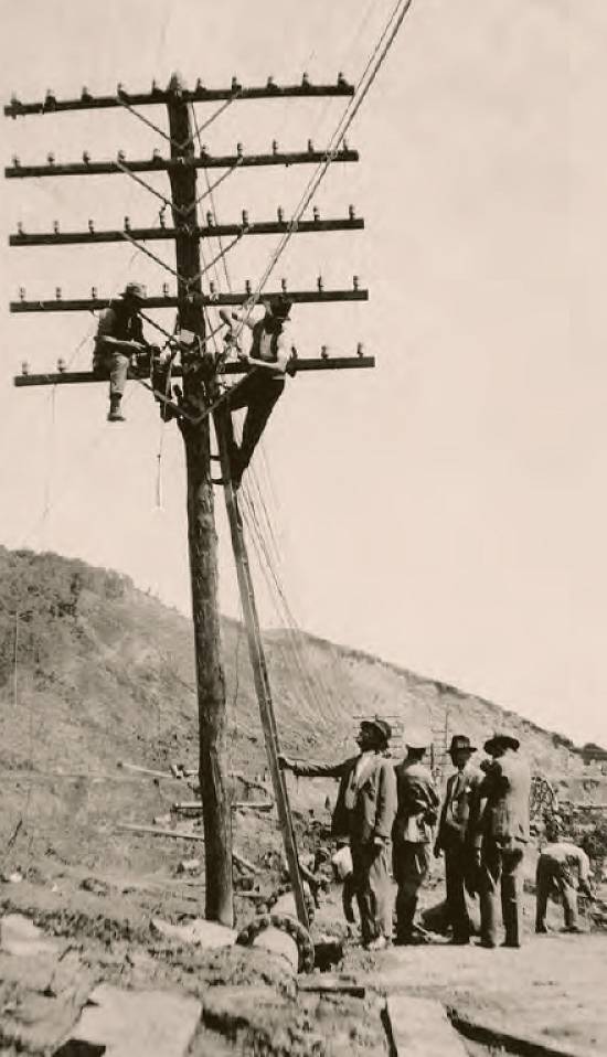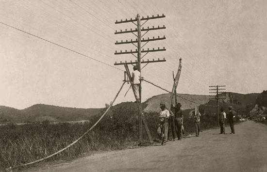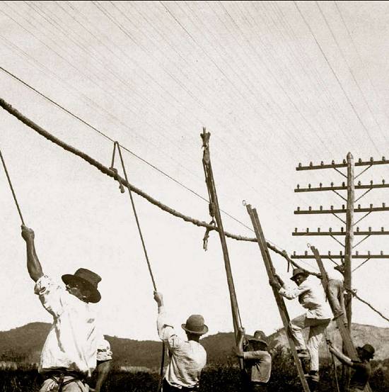 No trecho São Paulo/Santos, em fevereiro de 1930, trabalhadores executam modificação de cabo