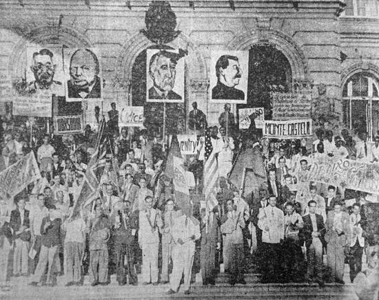 Indescritível entusiasmo popular sobreveio às primeiras notícias da capitulação dos alemães na Europa. O triunfo dos Aliados provocou ruidosa alegria no seio de todas as classes sociais, dando lugar a comício e manifestações em homenagem aos líderes da vitória e à Força Expedicionária Brasileira.