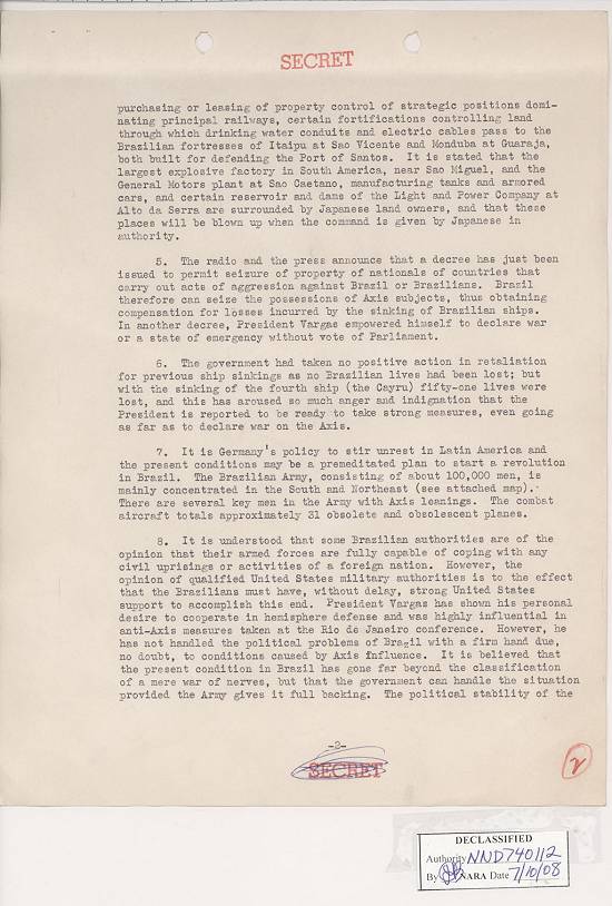 3. Atividades de quinta-coluna no Brasil têm crescido mais ousado com os reveses aliados, e a inquietação, especialmente nos estados do Sul, está aumentando. A propaganda do Eixo foi intensificada e enfatiza a incapacidade dos Estados Unidos para fornecer equipamentos de guerra ou apoiar o Brasil com navegação adequada.