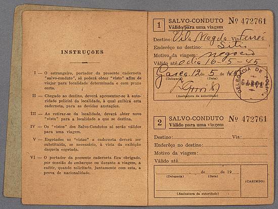 Durante a Segunda Guerra Mundial, cidadãos estrangeiros precisavam de um salvo-conduto para viagem, como nesta caderneta emitida pela Delegacia de Ordem Política e Social (Dops) da Secretaria de Estado dos Negócios da Segurança Pública, de São Paulo, que registra uma viagem autorizada pela polícia de Garça-SP para Vila Magda, por ferrovia, no dia 16 de maio de 1945, com o objetivo de "negócios" no sítio do portador. O documento [capa e duas folhas internas] foi também divulgado pela National Diet Library, no Japão (acesso em 20/9/2012):