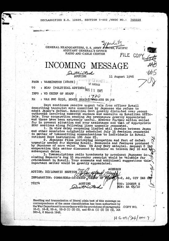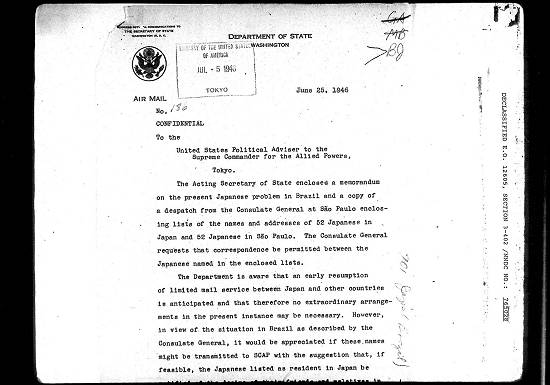 A Secretaria Interina de Estado inclui um memorando sobre o atual problema japonês no Brasil e uma