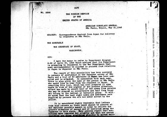 Japanese in São paulo. The Consulate General requests that correspondence be permitted between the Japanese named in the enclosed lists.