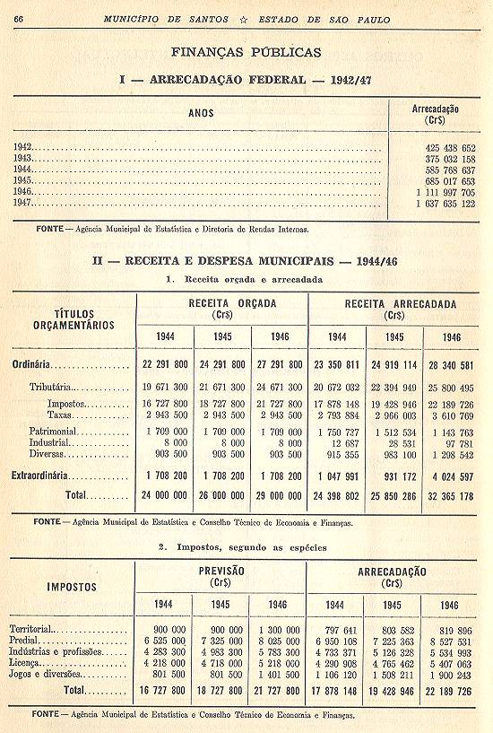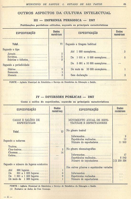 Clique nesta imagem para ir ao índice da obraTendo como referência o dia 1º de setembro de 1940, foi realizado mais um censo demográfico decenal em Santos. Oito anos depois, em 1948, o Instituto Brasileiro de Geografia e Estatística (IBGE)/Conselho Nacional de Estatística publicou no Rio de Janeiro/RJ esta Sinopse Estatística do Município de Santos - Estado de São Paulo, com 78 páginas e uma planta cartográfica regional, de que resta um exemplar na Biblioteca Pública Alberto Sousa, de Santos, cedido em maio de 2010 para digitalização por Novo Milênio, através da bibliotecária Bettina Maura Nogueira de Sá: