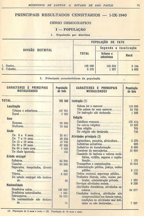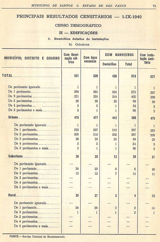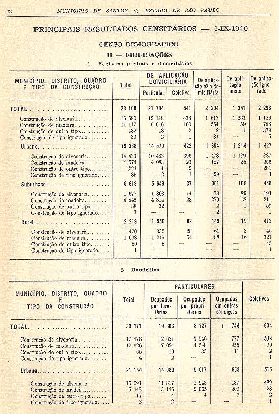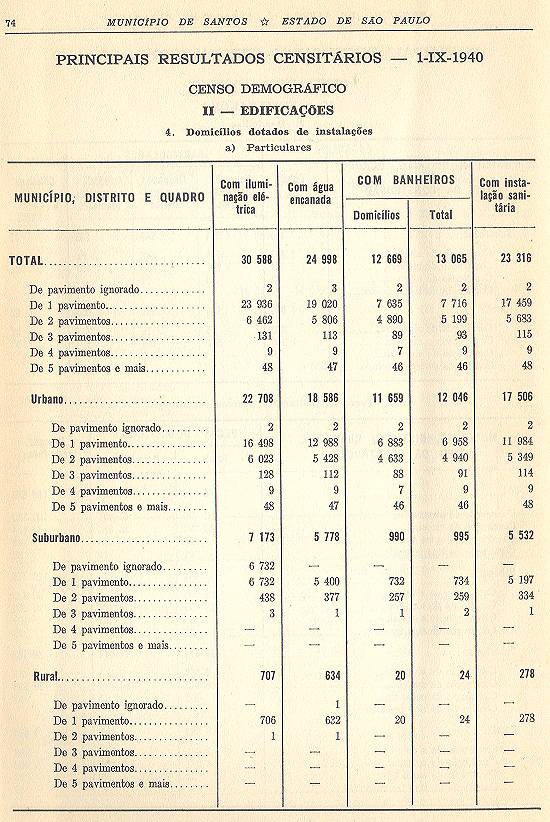 Clique nesta imagem para ir ao índice da obraTendo como referência o dia 1º de setembro de 1940, foi realizado mais um censo demográfico decenal em Santos. Oito anos depois, em 1948, o Instituto Brasileiro de Geografia e Estatística (IBGE)/Conselho Nacional de Estatística publicou no Rio de Janeiro/RJ esta Sinopse Estatística do Município de Santos - Estado de São Paulo, com 78 páginas e uma planta cartográfica regional, de que resta um exemplar na Biblioteca Pública Alberto Sousa, de Santos, cedido em maio de 2010 para digitalização por Novo Milênio, através da bibliotecária Bettina Maura Nogueira de Sá: