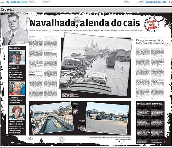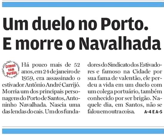 UM DUELO NO PORTO. E MORRE O NAVALHADA - Há pouco mais de 52 anos, em 24 de janeiro de 1959, era assassinado o estivador Antônio André Carrijó. Morria um dos principais personagens do Porto de Santos, Antoninho Navalhada. Nascia uma das lendas do cais. Um dos fundadores do Sindicato dos Estivadores e famoso na Cidade por sua fama de valentão, ele perdeu a vida em um duelo com um colega portuário, também conhecido por ser brigão. Naquele dia, em Santos, não se falou em outra coisa
