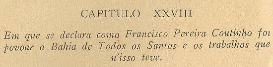 Quem quiser saber quem foi Francisco Pereira Coutinho, leia os livros da Índia, e sabe-lo-á; e verão seu grande valor e heróicos feitos, dignos de diferente descanso do que teve na conquista do Brasil, onde lhe coube por sorte a capitania da Bahia de Todos os Santos, de que lhe fez mercê el-rei d. João III, de gloriosa memória, pela primeira vez, da terra que há da ponta do Padrão até o Rio de São Francisco, ao longo do mar; e, para o sertão, de toda a terra que couber na demarcação deste Estado, e lhe fez mercê da terra da Bahia com seus recôncavos.