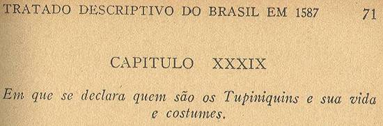 Este gentio é da mesma cor baça e estatura que o outro gentio de que falamos, o qual tem a linguagem, vida e costumes e gentilidades dos tupinambás, ainda que são seus contrários, em cujo título se declarará mui particularmente tudo o que se pode alcançar. E ainda que são contrários os tupiniquins dos tupinambás, não há entre eles na língua e costumes mais diferença da que têm os moradores de Lisboa dos da Beira; mas esse gentio é mais doméstico e verdadeiro que todo outro da costa deste Estado.