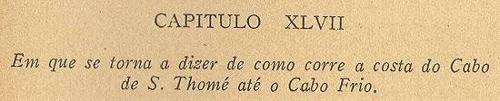 Da Ilha de Santa Ana à Baía do Salvador são três léguas e dessa baía à Baía Formosa são sete léguas; da Baía Formosa ao Cabo Frio são duas léguas. E corre-se a costa Norte-Sul. Até essa Baía Formosa corriam os goitacases no seu tempo, mas vivem já mais afastados do mar, pelo que não há que arrecear para se povoar qualquer parte desta costa do Espírito Santo até o Cabo Frio.