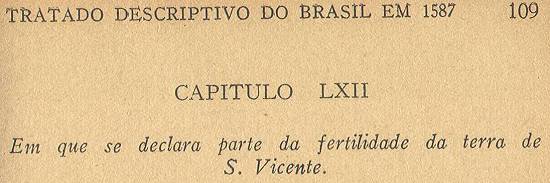Nestas capitanias de São Vicente e Santo Amaro são os ares frios e temperados, como na Espanha, cuja terra é mui sadia e de frescas e delgadas águas, em as quais se dá o açúcar muito bem, e se dá trigo e cevada, do que se não usa na terra por os mantimentos dela serem muito bons e facilíssimos de granjear, de que os moradores são mui abastados e de muito pescado e marisco, onde se dão tamanhas ostras que têm a casca maior que um palmo, e algumas muito façanhosas. Do trigo usam somente para fazerem hóstias e alguns mimos.