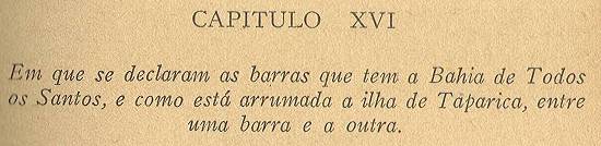 Acima fica dito como dista a Ponta de Tinharé da do Padrão nove ou dez léguas, entre as quais pontas da banda de dentro delas está lançada uma