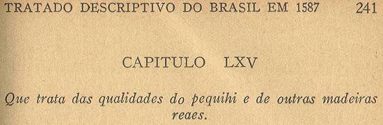 Sabucaí [sapucaia] é outra árvore real que nunca apodreceu, assim debaixo da terra como sobre ela, de cujo fruto tratamos atrás, cuja madeira é vermelhaça, dura e tão pesada que se vai ao fundo; da qual se acham grandes árvores, de que se fazem gangorras, mesas, eixos, fusos, virgens, esteios e outras obras dos engenhos. Quando se cortam estas árvores tinem nelas os machados como se dessem por ferro, onde se quebram muito.