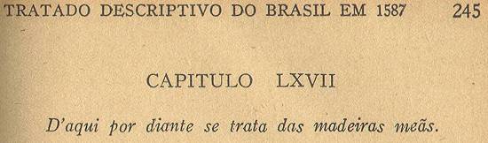 E comecemos no camaçari que são árvores naturais de areias e terras fracas. São estas árvores muito compridas e direitas, das quais se tiram frechais e tirantes para engenhos de cem palmos, e de cento e vinte de comprido e dois de largo, palmo e meio afora o delgado da ponta, que serve para outras coisas; a qual madeira serve para toda a obra das casas, do que se faz muito tabuado para elas e para os navios.