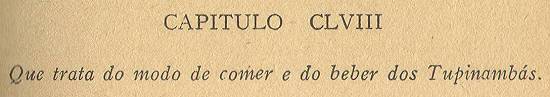 Já fica dito como os principais dos tupinambás quando comem, estão deitados na rede, e como comem com eles os parentes, e os agasalha consigo; entre os quais comem também os seus criados e escravos, sem lhe terem nenhum respeito; antes quando o peixe ou carne não é que sobeje, o principal o reparte por quinhões iguais, e muitas vezes fica ele sem nada, os quais estão todos em cócoras, com a vasilha em que comem todos no chão no meio deles, e enquanto comem não bebem vinho, nem água, o que fazem depois de comer.