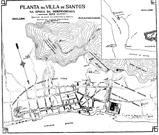 Porto de Santos, que, pelos cuidados do seu fundador, foi ereta em Vila, nos fins do ano de 1546. Teve seu princípio junto ao Outeirinho de Santa