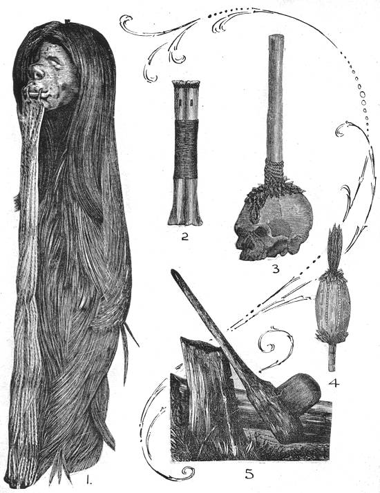 Relíquias de índios: 1) cabeça mumificada de índio Mandurucu; 2) Membi, flauta de osso, dos