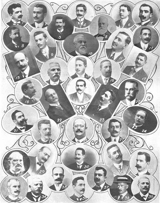 Comerciantes paulistas: 1) Dr. Claudio de Souza; 2) Urbano de Mello; 3) Manoel Martins Gonçalves; 4) Alexandre Villela; 5) Coronel Antonio Proost Rodovalho; 6) Dr. Oscar Moreira; 7) P. Ares; 8) L. Grumbach; 9) O. Anacleto; 10) George Baggott; 11) Leonidas Moreira; 12) José M. Alves Ferreira Junior; 13) Cyril L. Stock; 14) Cavaleiro Enrico Secchi; 15) Torquato Caleiro; 16) José Martins Borges; 17) Antonio Rodrigues Guimarães; 18) Thomaz A. Alves Saraiva; 19) João Prado; 20) Nicolau Baruel; 21) Dr. Antonio Proost Rodovalho Junior; 22) C. Manderbach; 23) J. Zlatoporsky; 24) Leon Bergman; 25) Christiano P. Vianna; 26) J. da Costa Ramalho Ortigão; 27) Cassio Muniz de Souza; 28) E. Vanorden; 29) W. Rieckmann; 30) Pedro Weingull; 31) Antenor de Lara Campos; 32) G. Knoblauch; 33) Comendador Joaquim d'Abreu de Lima Pereira Coutinho; 34) Roberto Secchi; 35) Dr. Oscar Horta; 36) Engenheiro Ernesto Dias de Castro; 37) Luiz Perroni; 38) Charles Hü; 39) Attilio Secchi