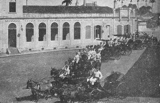 Os carros que compõem a prontidão acima são: 1 bomba a vapor, 1 carro de mangueiras com 500 metros de dita, 1 carro de transporte de pessoal que leva também 150 metros de mangueiras,