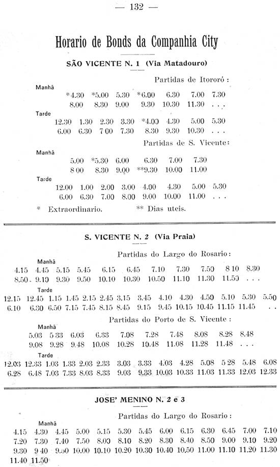 José Menino Nº 3 - Partidas do Largo do Rosário - De 4h30 às 6 da manhã, de 30 em 30 minutos. De 6h20 da manhã às 7h40 da noite, de 20 em 20 minutos. De 8h00 às 12h00 da noite de 30 em