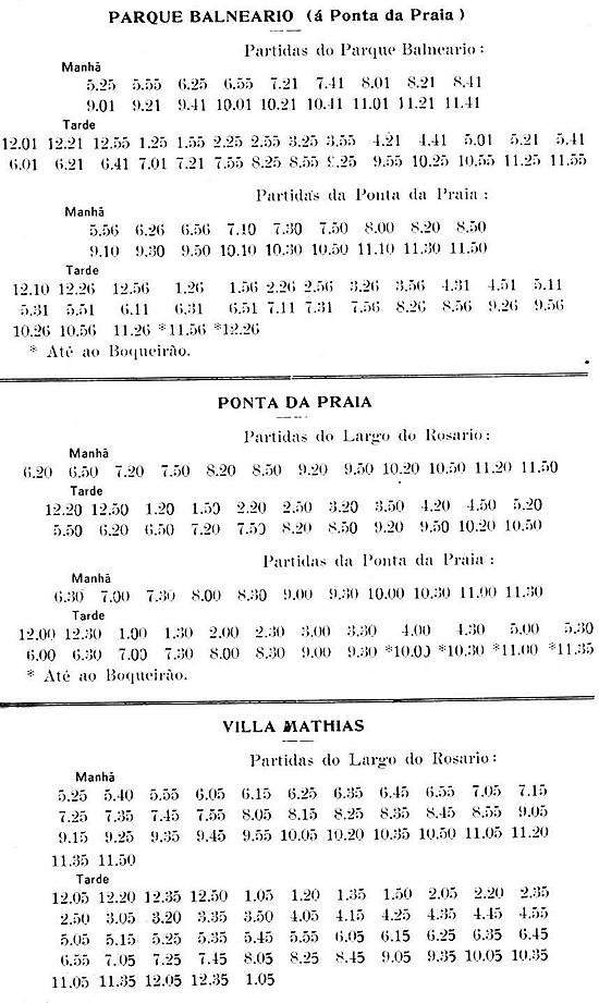 Ponta da Praia - Partidas da Estação da E. de Ferro: manhã 10h11; tarde 6h37. Partidas da Ponta da Praia: manhã 6h20; tarde 3h20.