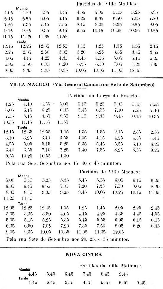Vila Macuco Nº 5 - Partidas do Largo do Rosário - De 4h20 da manhã às 8h05 da noite, de 15 em 15 minutos. De 8h35 às 11h05 da noite, de 30 em 30 minutos, e 11h20, último bonde.