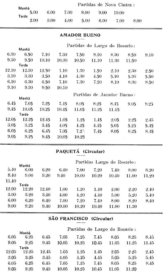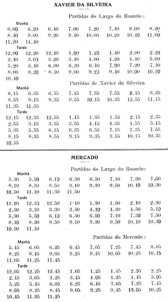 Xavier da Silveira - Partidas do Largo do Rosário - De 6h00 da manhã às 10h40 da noite, de 20 em 20 minutos.