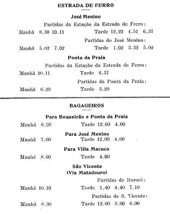 Estrada de Ferro - José Menino - Partidas da Estação da E. de Ferro: manhã 8h30, 10h11; tarde 12h22, 4h51, 6h37. Partidas do José Menino: Manhã 5h02, 7h02, 9h22; tarde 1h02, 3h32, 5h02.