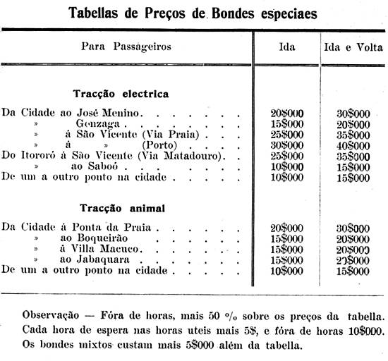 Linha Nº 4 - O preço das passagens nesta linha é de 300 réis do Largo do Rosário ao Boqueirão, em 3 seções de 100 réis cada uma, sendo a 3ª seção entre Gonzaga e Boqueirão.