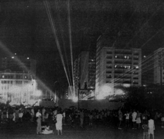 Rua Senador Feijó. Ainda estava programado para ontem à noite, a partir das 21 horas, o espetáculo Bombeiros de Santos, 100 anos de água e luz,