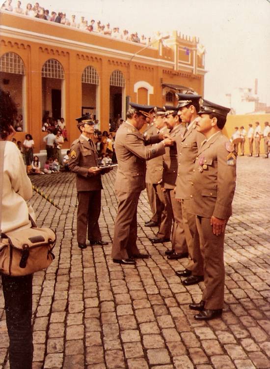 Cerimônia de condecoração de bombeiros no pátio do Castelinho, na década de 1980