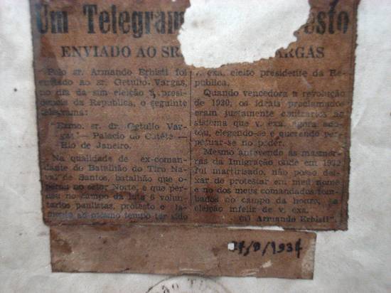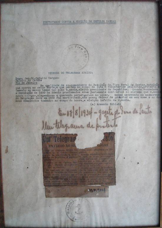 da Imigração, onde em 1932 fui martirizado, não posso deixar de protestar em meu nome e no dos meus comandados tombados no campo da honra, a eleição