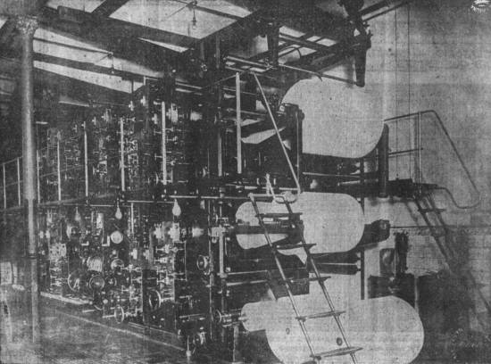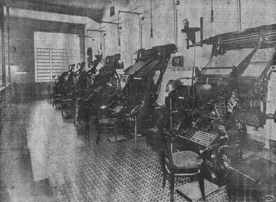 Uma das seções de linotipia, são doze as máquinas de linotipo com que conta A Tribuna, todas novas e em excelentes condições de funcionamento. Estão instaladas em local espaçoso e amplo, ocupando grande parte do que, no jornal, é designado como "oficinas"