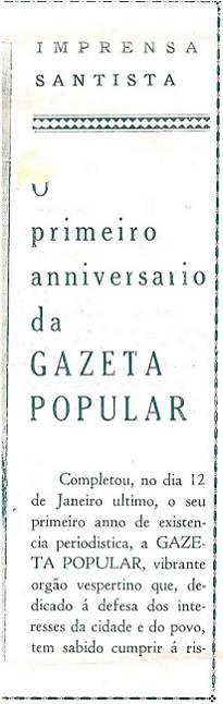 [...] (N.E.: trecho dilacerado no original) exclusivamente dele, no que o povo representa de trabalho honesto e de esforço construtor, quer a GAZETA POPULAR o julgamento expressivo porque, no dia em que lhe faltar a simpatia das massas, sobretudo das massas humildes que