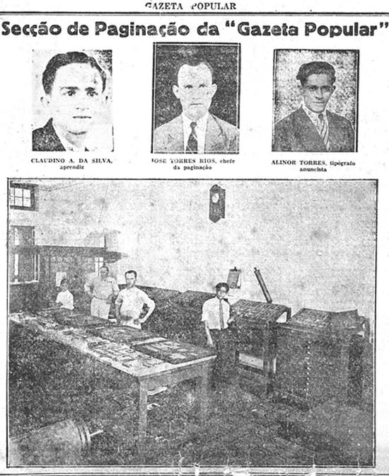 Seção de paginação da Gazeta Popular, com os funcionários Claudino A. da Silva (aprendiz), José Torres Rios (chefe da paginação) e Alinor Torres (tipógrafo anuncista)