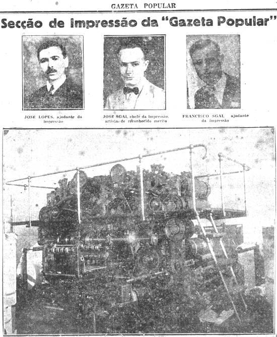 Seção de impressão, com os funcionários José Lopes (ajudante da impressão), José Sgal (chefe da impressão, "artista de reconhecido mérito") e Francisco Sgal (ajudante de impressão)