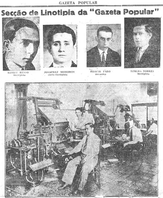 Seção de linotipia da Gazeta Popular, com os funcionários Romeu Russo (linotipista), Josaphat Medeiros (chefe-linotipista), Moacir Faro (mecânico) e Djalma Torres (linotipista)