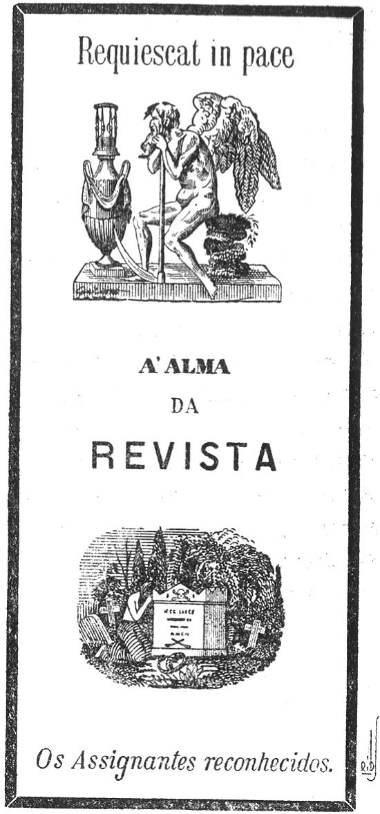 uma alegoria, tarjada de luto, em que figuravam estas expressões, entre dois desenhos chocarreiros: Resquiecat in pace, À alma da revista. Os assinantes reconhecidos.