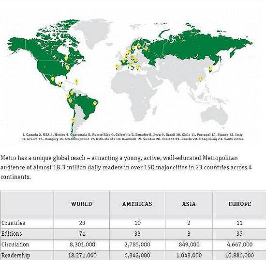 esgotada. A proposta de distribuição gratuita do jornal é descrita assim por Pelle Tornberg, ex-CEO da Metro International: "O Metro informa de maneira rápida, sem perda de tempo e se
