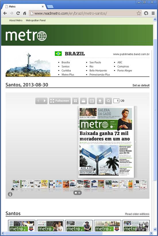 Página do jornal Metro no site para Santos: 20 mil exemplares/dia, impresso na Metromídia Gráfica. Edição Santos: Rua José Caballero, 15, Gonzaga.