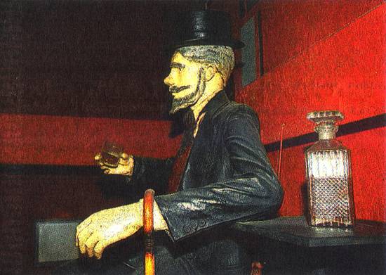 À primeira vista, pode parecer estranha a figura que se projeta da parede, de um homem sentado em uma cadeira com um copo de whisky em uma mão, uma