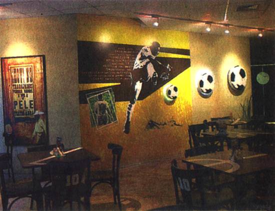 entrada, uma réplica apresenta a pegada do Rei com a famosa assinatura do camisa 10 da seleção. A camisa, aliás, é o modelo das cadeiras. O cliente pode escolher se quer ficar no meio-de-campo ou escanteio, por exemplo. Partes diferentes das linhas