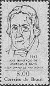 JOSÉ BONIFÁCIO - O Patriarca da Independência do Brasil tem a sua efígie reproduzida em diversos selos. O mais recente é comemorativo do bicentenário de seu nascimento, em 13 de junho de 1963