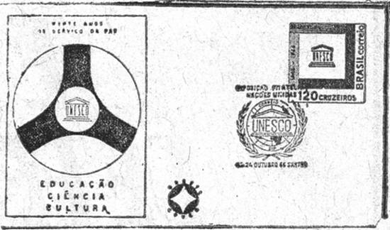 UNESCO - Santos destaca-se também no cenário filatélico mundial através de exposições filatélicas que realiza anualmente no Dia das Nações Unidas. Em 1966 ali foi usado um carimbo comemorativo especial do 20º aniversário da Unesco, cujo envelope de 1º Dia de Circulação foi editado pelo Brasil Cover