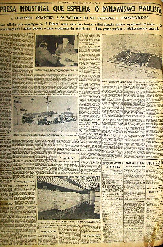Os depósitos da Antarctica – Além da filial de Santos – informou-nos o sr. Vasone, mantemos ainda alguns depósitos para os nossos produtos, figurando entre eles o Depósito Central, os do Guarujá, Cubatão e São Vicente. Esses depósitos, como não poderia deixar de ser, sofreram fundamental reforma, sendo feita uma reorganização eficiente e capaz de apresentar os melhores resultados. Graças ao aparelhamento de que os mesmos dispõem, assim como a excelência dos produtos da Antarctica, essa empresa mantém atualmente completo domínio no mercado.