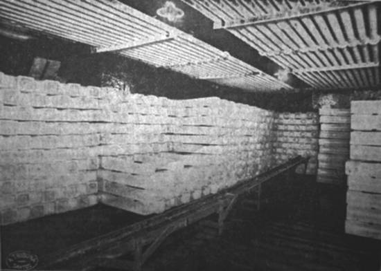 Esta gravura nos mostra o depósito da fábrica de gelo da filial em Santos da Antarctica Paulista, onde o nosso representante arrostou com a temperatura glacial de 3 graus abaixo de zero