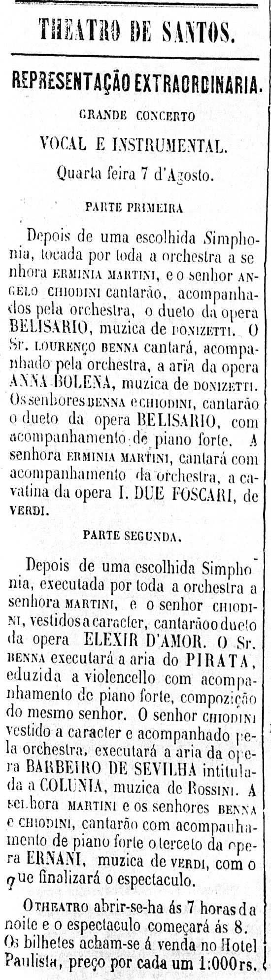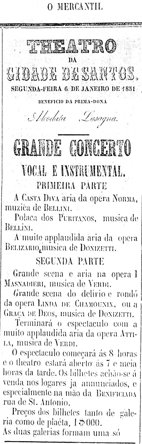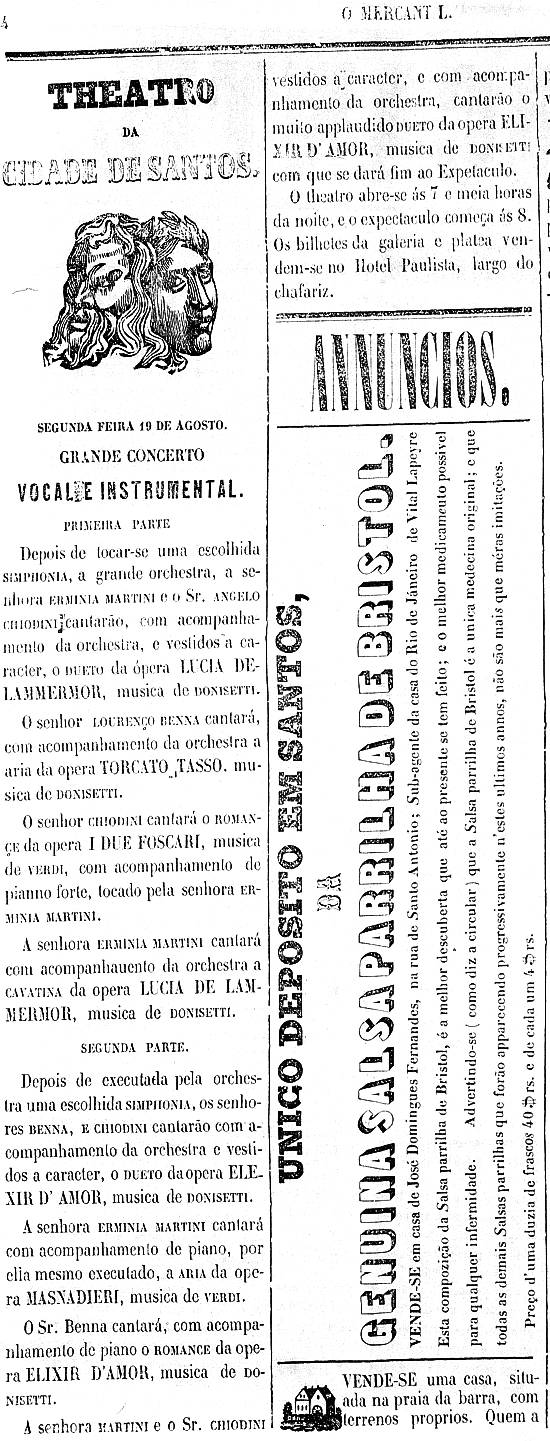 Teatro de Santos - apresentação musical. Anúncio de venda de salsaparrilha