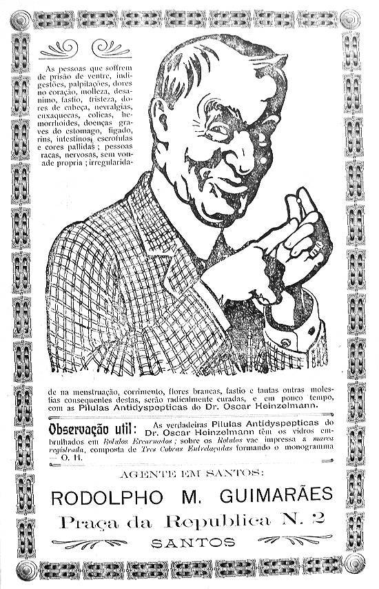 Rodolpho M. Guimarães, agente em Santos das pílulas antidispépticas do dr. Oscar Heinzelmann Publicado na primeira contracapa da revista A Fita nº 3 (ano I), de 15 de maio de 1911 Exemplar no acervo da Sociedade Humanitária dos Empregados no Comércio de Santos (SHEC)