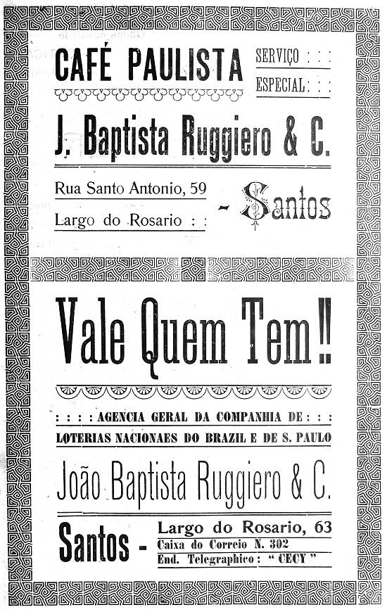 Café Paulista e Vale Quem Tem/João Baptista Ruggiero & C. Publicado na revista santista A Fita nº 3 (ano I), de 15 de maio de 1911 Exemplar no acervo da Sociedade Humanitária dos Empregados no Comércio de Santos (SHEC)