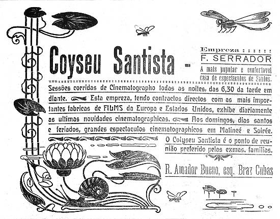 Colyseu Santista, de F. Serrador (grafado erroneamente nesse anúncio, em várias edições) Publicado na revista santista A Fita nº 3 (ano I), de 15 de maio de 1911 Exemplar no acervo da Sociedade Humanitária dos Empregados no Comércio de Santos (SHEC)