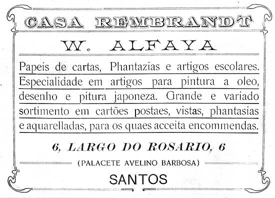 Casa Rembrandt, de W. Alfaya, situada no Palacete Avelino Barbosa Publicado na revista santista A Fita nº 3 (ano I), de 15 de maio de 1911 Exemplar no acervo da Sociedade Humanitária dos Empregados no Comércio de Santos (SHEC)