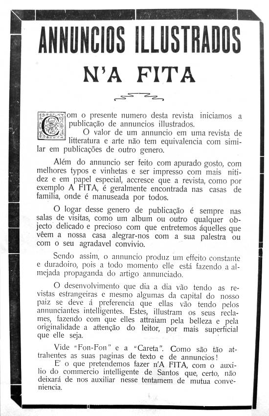 A Fita - início de publicação de anúncios ilustrados Publicado na primeira contracapa capa da revista A Fita nº 4 (ano I), de 12 de junho de 1911 Exemplar no acervo da Sociedade Humanitária dos Empregados no Comércio de Santos (SHEC)